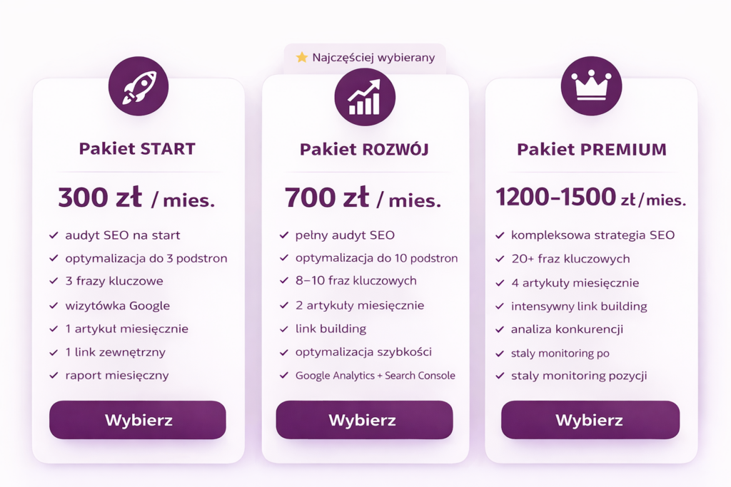 Koszt zależy od konkurencji, branży i zakresu działań. Dlatego oferuję 3 pakiety – od 300 zł miesięcznie – dopasowane do potrzeb małych firm, usług lokalnych i sklepów internetowych.